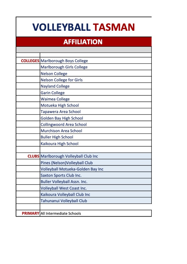In 2021 the Tasman Volleyball (TVA) Executive resolved that a VTI Affiliation Fee be established and is payable by both Clubs and the Colleges in the region. The Fees collected would in part pay the VNZ Affiliation Fee.